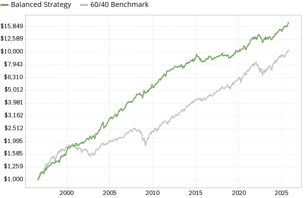 The chart below compares the performance of our Balanced investment strategy to a typical “buy and hold” portfolio consisting of 60% stocks and 40% bonds. The Balanced strategy has been consistently profitable, with a compound annual growth rate (CAGR) of 10.3%. An initial investment of $1,000 in 1996 would be worth $17,315 today [1].