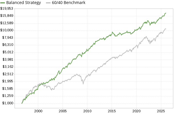 The chart below compares the performance of our Balanced investment strategy to a typical “buy and hold” portfolio consisting of 60% stocks and 40% bonds. The Balanced strategy has been consistently profitable, with a compound annual growth rate (CAGR) of 10.3%. An initial investment of $1,000 in 1996 would be worth $17,751 today [1].